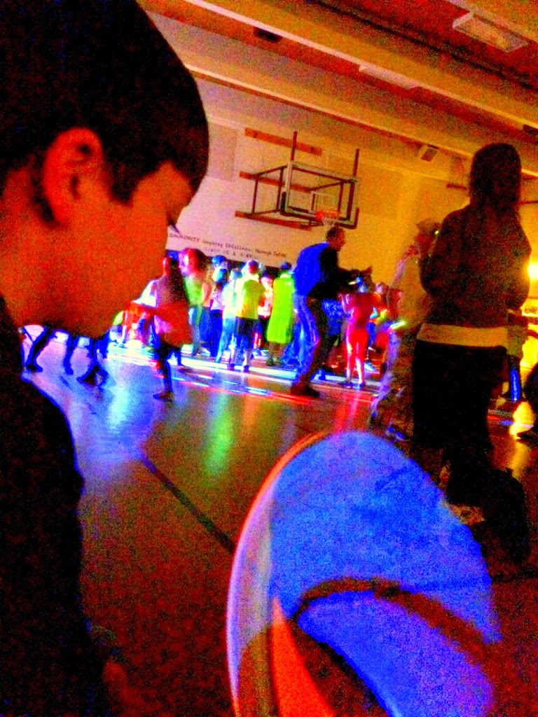 Our sixth-grader has graduated from elementary, and often laments over the simpler days of yore. I encouraged him to come to the dance with me, “for old times sake.” He did, and I think this pretty much fixed his pining inclinations. After a while of wandering around with a couple of his pals, he decided he was too old for this nonsense, and sat with me on the sidelines, spinning a neon bracelet.
