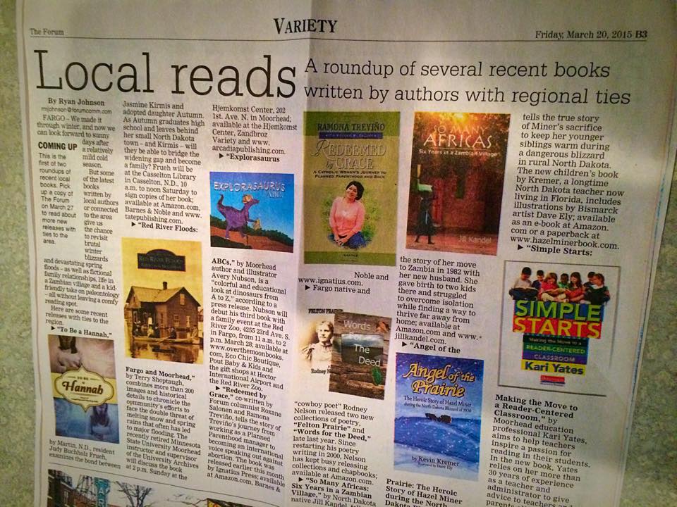 Speaking of keeping things light and fun, it was a neat surprise to open our daily newspaper on Friday — The Forum, the one for which I write as a regular contributor — and find a little mention of Ramona’s story that I co-authored — “Redeemed by Grace.” The splash of color made me smile, too.