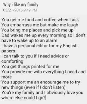 And not only good, but healing. Was this just a case of a child saying what a parent wanted to hear? Maybe. But I don’t really think so. I think at least a little thought went into its concoction. I perceive the list as having come from the heart of a child truly thinking, if only just for a burst, about what life would be like in the absence of the provisions that are too easily taken for granted, because, well, it’s an easy thing to do, is it not? Take the things we do for one another, and even just the presence of one another in our lives, for granted?