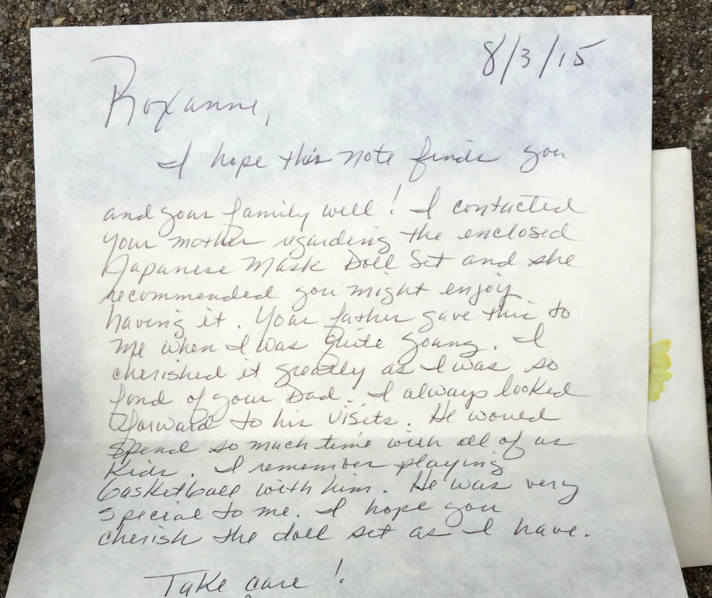 “I hope this finds you and your family well!” it began. “I contacted your mother regarding the enclosed Japanese mask doll set and she recommended you might enjoy having it. Your father gave this to me when I was quite young. I cherished it greatly as I was so fond of your Dad. I always looked forward to his visits. He would spend so much time with all of us kids. I remember playing basketball with him. He was very special to me. I hope you cherish the doll set as I have.”
